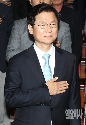 신당 창당을 선언한 천정배 의원이 20일 오전 서울 여의도 국회의원회관에서 열린 신당 창당 선언 기자회견에서 국민의례를 하고 있다.
