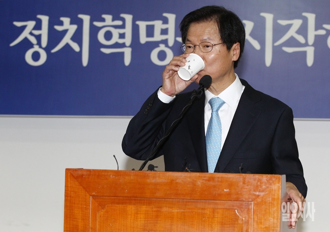 신당 창당을 선언한 천정배 의원이 20일 오전 서울 여의도 국회의원회관에서 열린 신당 창당 선언 기자회견에서 물을 마시고 있다.