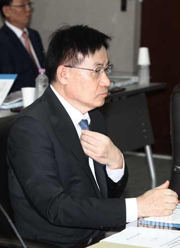 홍기택 KDB산업은행 회장이 21일 오전 서울 여의도 산업은행에서 열린 국회 정무위원회 국정감사에서 넥타이를 만지고 있다.