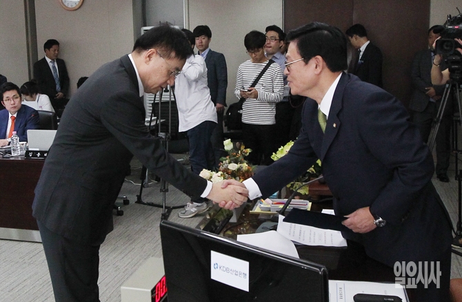 홍기택 KDB산업은행 회장이 21일 오전 서울 여의도 산업은행에서 열린 국회 정무위원회 국정감사에서 정우택 국회 정무위원장과 악수를 나누고 있다.