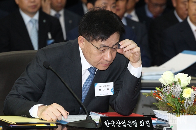 홍기택 KDB산업은행 회장이 21일 오전 서울 여의도 산업은행에서 열린 국회 정무위원회 국정감사에서 휴대폰을 보고 있다.