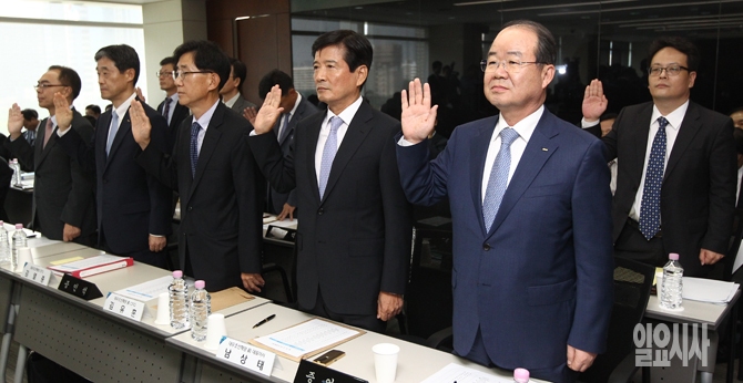 정성립 대우조선해양 대표이사를 비롯한 대우조선해양 관계자들이 21일 오후 서울 여의도 산업은행에서 열린 국회 정무위원회 국정감사에서 선서를 하고 있다.