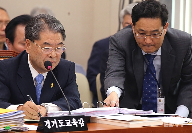 21일, 서울 여의도 국회 교육문화체육관광위원회 회의실서 열린 국회 교문위 국정감사 도중 한 관계자가 이재정 경기도교육감에게 자료를 제출하고 있다.