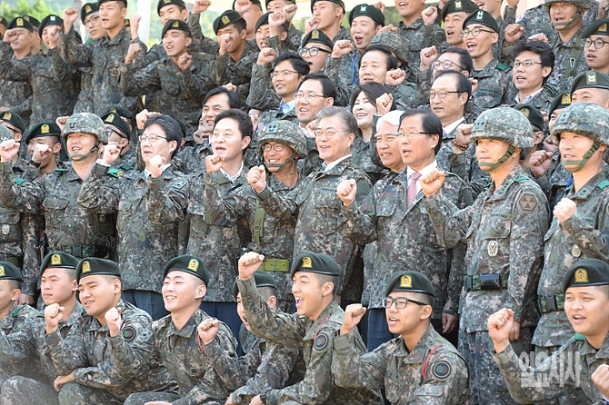 21일, 국회 국방위원회(위원장 정두언) 국정감사 현지시찰을 위해 새정치민주연합 문재인·새누리당 유승민 등 국방위원들이 경기도 파주시 적성면 소재의 군부대를 찾아 관계자과 파이팅을 외치고 있다.