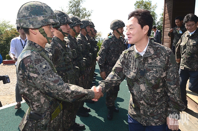 21일, 정두언 국회 국방위원장이 국정감사 현지시찰을 위해 경기도 파주시 적성면 소재의 태풍전망대를 찾아 군관계자와 악수를 나누고 있다.