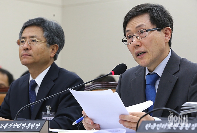 21일, 서울 여의도 국회 미래창조방송통신위원회 회의실에서 열린 한국인터넷진흥원 등에 대한 국정감사에서 윤종록 정보통신산업진흥원장이 의원들의 질의에 답변하고 있다.