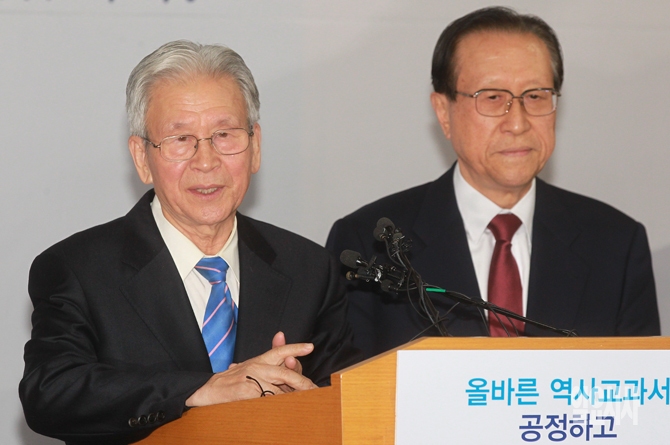 신영식 이화여대 명예교수가 4일 오전 서울 세종로 정부서울청사에서 가진 역사교과서 집필 기준과 집필진 구성 관련 브리핑 후 기자들의 질문에 답변하고 있다.