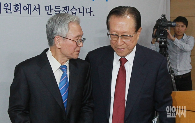 김정배 국사편찬위원장(오른쪽)이 4일 오전 서울 세종로 정부서울청사에서 가진 역사교과서 집필 기준과 집필진 구성 관련 브리핑 후 신영식 이화여자대학교 명예교수와 대화를 나누며 빠져 나가고 있다.