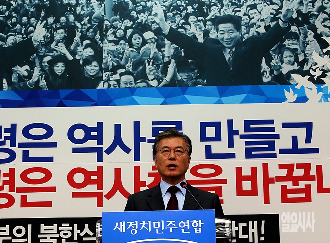 4일, 서울 여의도 국회서 새정치민주연합 문재인 대표가 최근 논란이 되고 있는 '역사 교과서 국정화'와 관련해 대국민담화를 발표하고 있는 가운데, 벽면에 고 노무현 전 대통령의 사진이 걸려 있다.