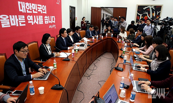 최근 새정치민주연합이 정부의 교과서 국정화 확정고시 직후 국회 의사일정을 보이콧하고 있는 가운데 4일, 서울 여의도 국회 당대표실서 새누리당 원유철 원내대표가 국회 정상화 촉구 기자회견을 갖고 있다.
