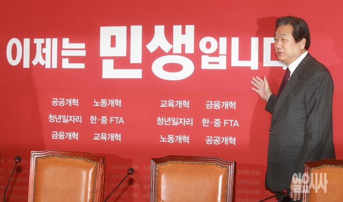 김무성 새누리당 대표가 5일 오전 서울 여의도 국회에서 열린 새누리당 최고위원회의 시작 전 바뀐 당 대표실 슬로건을 소개하고 있다.