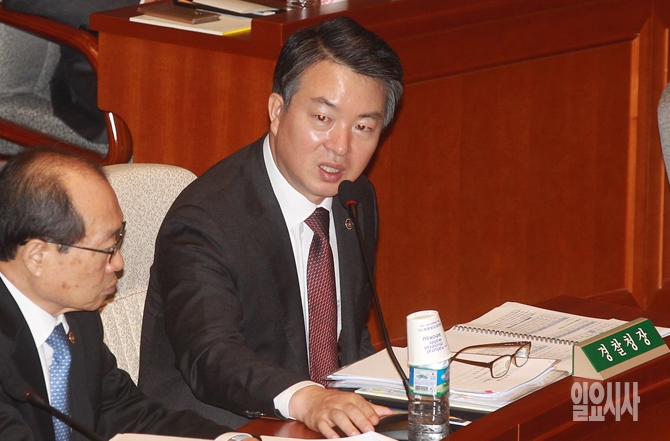 역사교과서 국정화 확정 고시 후폭풍으로 야당 의원들이 불참한 가운데 강신명 경찰청장이 5일 오전 서울 여의도 국회에서 열린 국회 예산결산특별위원회 전체회의에서 질문에 답변하고 있다.
