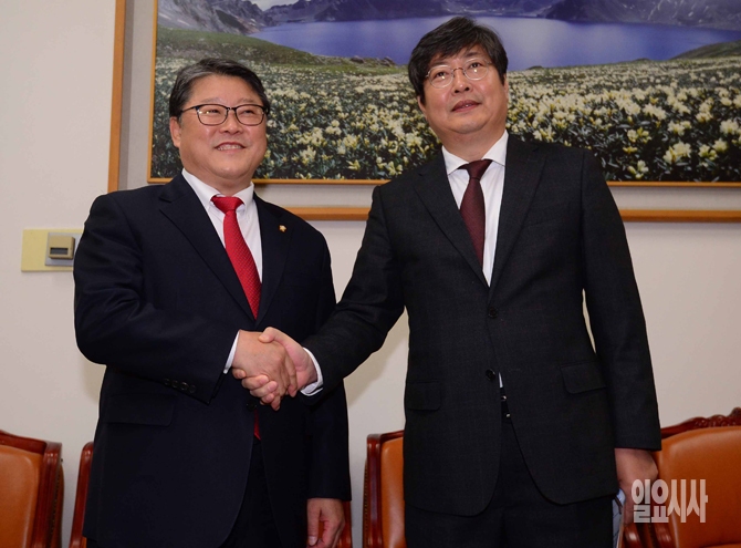 새누리당 조원진 원내수석부대표와 새정치민주연합 이춘석 원내수석부대표가 5일 오전 서울 여의도 국회에서 가진 국회 정상화 논의를 위한 회동에서 악수를 나누고 있다.