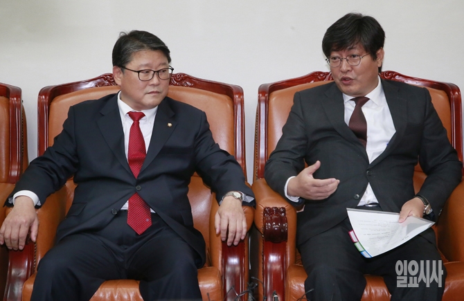 새누리당 조원진 원내수석부대표와 새정치민주연합 이춘석 원내수석부대표가 5일 오전 서울 여의도 국회에서 가진 국회 정상화 논의를 위한 회동에서 논의를 하고 있다.