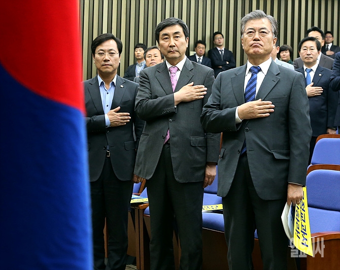 5일, 서울 여의도 국회서 '역사교과서 국정화 저지 시도당 연석회의'에 앞서 새정치민주연합 문재인 대표, 이종걸 원내대표 등이 불편한 표정으로 국민의례를 하고 있다.