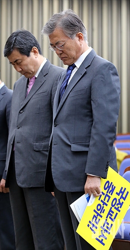 5일, 서울 여의도 국회서 '역사교과서 국정화 저지 시도당 연석회의'에 앞서 새정치민주연합 문재인 대표, 이종걸 원내대표가 잠시 묵념을 하고 있다.