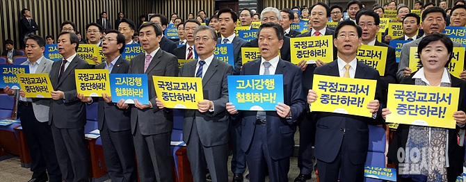 5일, 서울 여의도 국회서 '역사교과서 국정화 저지 시도당 연석회의'에서 새정치민주연합 문재인 대표, 이종걸 원내대표 등 의원들이 '국정교과서 중단하라' '고시강행 철회하라'는 손피켓을 들고 확정고시 철회를 요구하고 있다.
