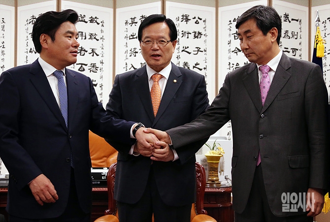 5일, 서울 여의도 국회 의장집무실서 정의화 국회의장-원유철-이종걸 양당 원내대표가 의사일정 협의를 위한 회동에 앞서 손을 잡고 있다.
