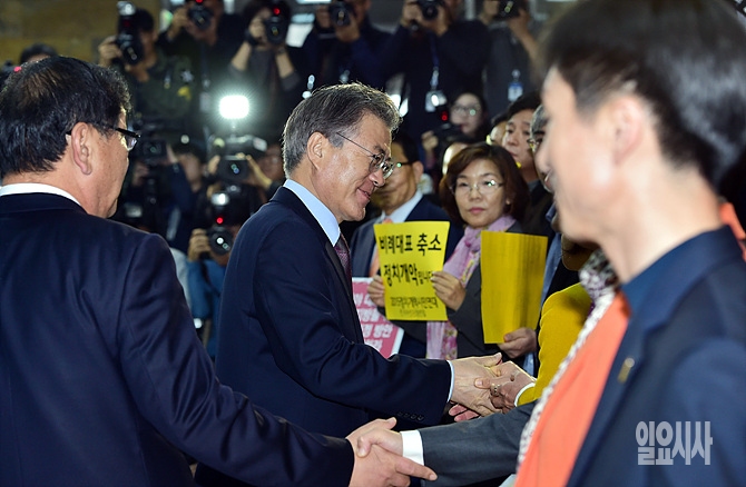 12일, 서울 여의도 국회 귀빈식당서 '선거구획정 4+4회동'이 예정된 가운데, 새정치민주연합 문재인 대표가 이동 도중, 정의당 한 관계자와 악수를 나누고 있다.