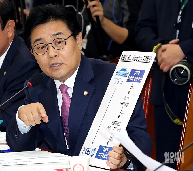 16일, 서울 여의도 국회서 열린 고대영 KBS 사장 후보자에 대한 인사청문회에서 새정치민주연합 전병헌 의원이 '청와대 의혹'과 관련해 고 후보자에게 질의를 하고 있다.