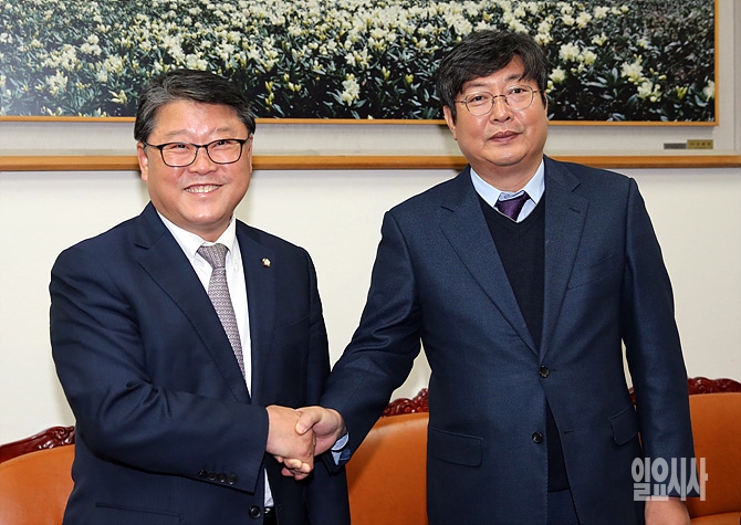 16일, 서울 여의도 국회에서 조원진·이춘석 여야 원내수석부대표가 쟁점 현안들에 대한 조율 회동에 앞서 악수를 나누고 있다.