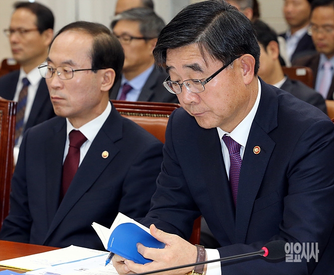16일, 서울 여의도 국회서 열린 환경노동위원회 전체회의에 앞서 이기권 고용노동부장관이 자신의 수첩을 확인하고 있다.