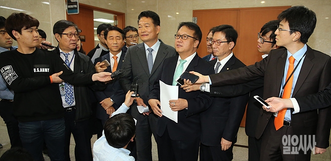 16일, 서울 여의도 국회 정론관 앞에서 새정치민주연합 민병두 의원, 송영길 전 인천시장 등 야권 중도성향인 '통합행동' 인사들이 기자회견 직후 취재진의 질문을 받고 있다.
