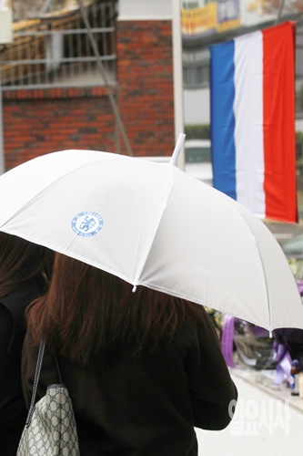 130여명의 목숨을 앗아간 프랑스 파리 연쇄 테러가 발생한지 사흘째인 16일 오후 서울 서대문구 주한프랑스대사관을 찾은 추모객들이 빗속에서 희생자들을 추모를 하고 있다.