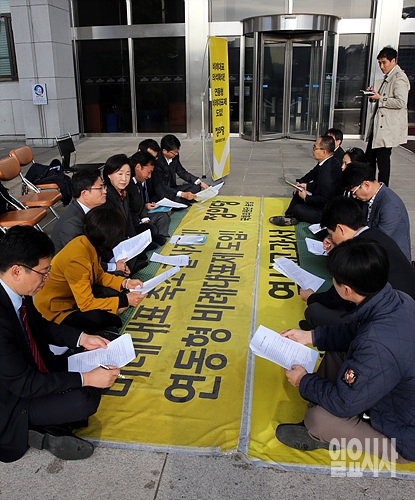 17일, 서울 여의도 국회 본청 앞에서 정의당 심상정 대표 등 주요 당직자들이 의원총회를 갖고 있다.