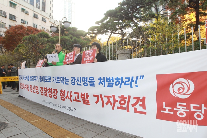 구교현 노동당 대표를 비롯한 노동당 관계자들이 17일 오전 서울 서대문구에 위치한 경찰청 앞에서 강신명 경찰청장 형사고발 기자회견을 갖고 있다.
