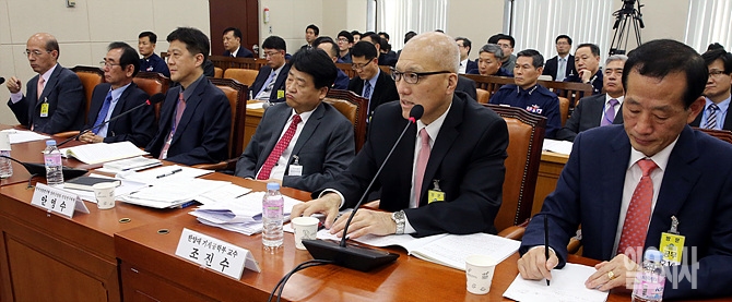 17일, 서울 여의도 국회서 열린 국방위원회 한국형전투기(KF-X) 사업관련 공청회에서 이경태 항공안전기술원장 등 전문가들이 발언하고 있다. (왼쪽부터 국방과학연구소 이범석 3본부 2부장, 전영훈 골든이글공학연구소장, 이경태 항공안전기술원장, 안영수 한국산업연구원 방위산업팀 선임연구위원, 조진수 한양대 기계공학부 교수, 이희우 충남대 종합군수체계 연구소장)
