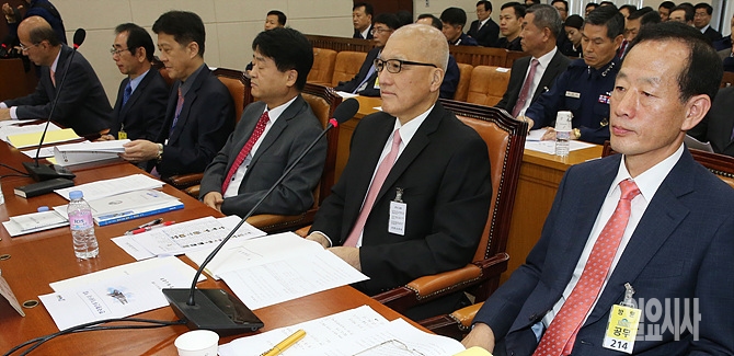 17일, 서울 여의도 국회서 열린 국방위원회 한국형전투기(KF-X) 사업관련 공청회에 앞서 관련 전문가들이 참석해 있다. (왼쪽부터 국방과학연구소 이범석 3본부 2부장, 전영훈 골든이글공학연구소장, 이경태 항공안전기술원장, 안영수 한국산업연구원 방위산업팀 선임연구위원, 조진수 한양대 기계공학부 교수, 이희우 충남대 종합군수체계 연구소장)