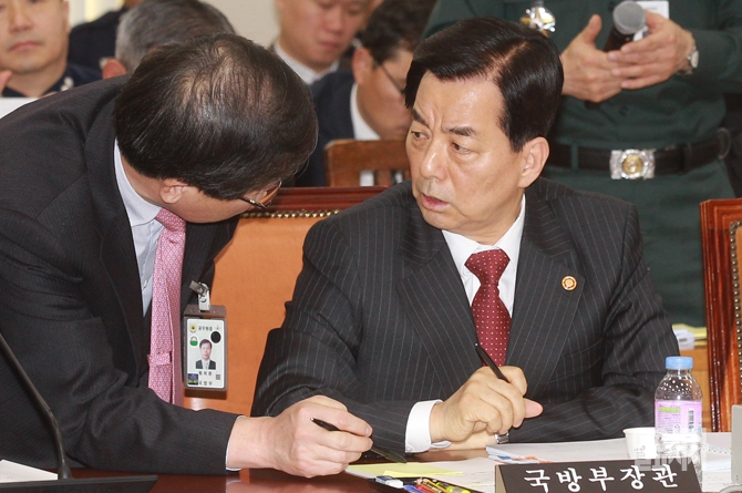 한민구 국방부 장관이 17일 오후 서울 여의도 국회에서 열린 한국형 전투기(KF-X) 사업 관련 국회 국방위원회 전체회의에서 관계자와 논의를 하고 있다.