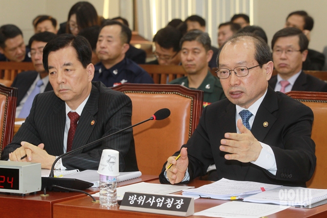 장명진 방위사업청장이 17일 오후 서울 여의도 국회에서 열린 국회 국방위원회 전체회의에서 한국형 전투기(KF-X) 사업과 관련해 여야 의원들의 질의에 답변하고 있다.