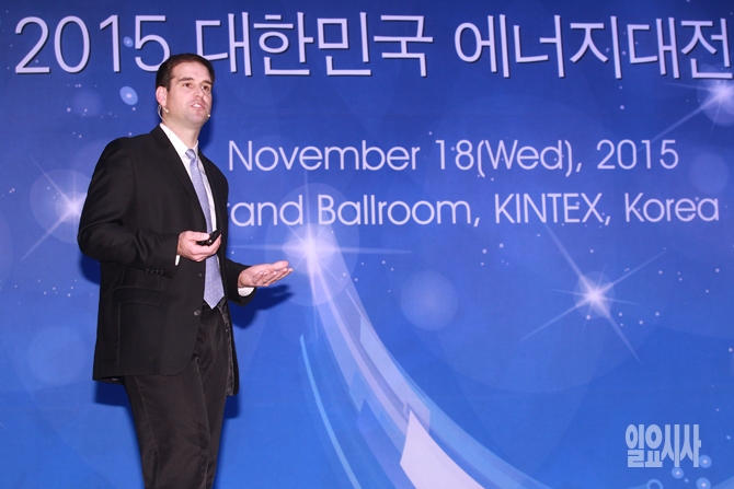 미국 테슬라모터스의 공동창업자이자 최고기술책임자(CTO)인 JB 스트라우벨이 18일 오전 경기도 일산 킨텍스에서 열린 에너지코리아 포럼 2015에서 기조연설을 하고 있다.