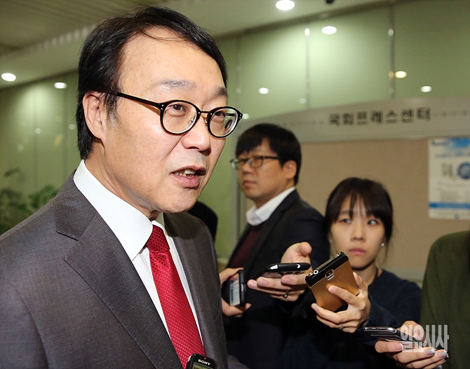18일, 서울 여의도 국회서 새누리당 김무성 대표의 처남 최양오씨가 20대 총선 서초갑 출마 기자회견 직후 취재진의 질문에 답변하고 있다.