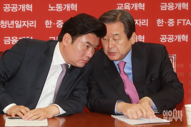 새누리당 김무성 대표와 원유철 원내대표가 19일 오전 서울 여의도 국회에서 열린 새누리당 최고위원회의에서 대화를 나누고 있다.