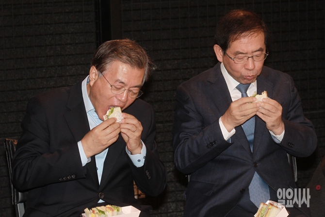 문재인 새정치민주연합 대표와 박원순 서울시장이 19일 오후 서울 중구 시민청에서 열린 '문재인·박원순, 고단한 미생들과의 간담회'에서 샌드위치를 먹고 있다.