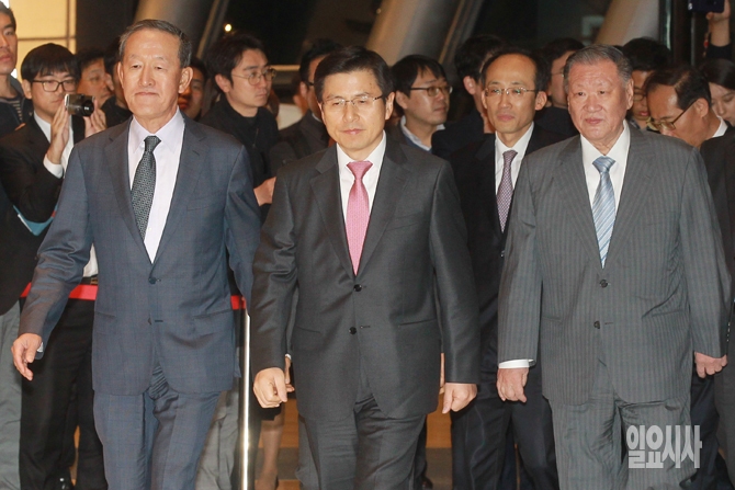 황교안 국무총리가 19일 오후 서울 여의도 전경련회관에서 열린 국무총리 초청 전경련 회장단 초청 만찬에서 전경련 회장인 허창수 GS그룹 회장과 정몽구 현대자동차그룹 회장 등과 함께 만찬장으로 이동하고 있다.