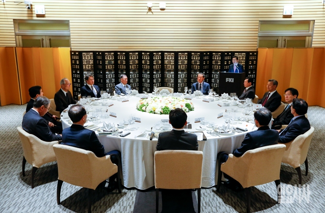 19일 오후 서울 여의도 전경련회관에서 황교안 국무총리, 허창수 전경련 회장, 정몽구 현대자동차그룹 회장, 최태원 SK그룹 회장, 신동빈 롯데그룹 회장 등이 참석한 가운데 국무총리 초청 전경련 회장단 초청 만찬이 열리고 있다.