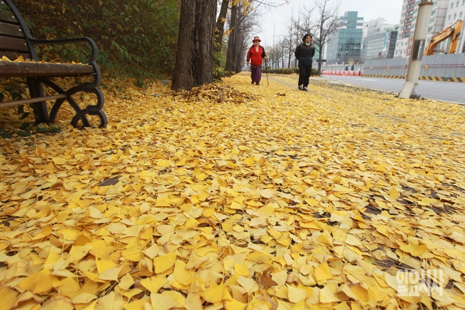 가을의 끝자락이 가까워진 20일 오전 서울 송파구 올림픽공원 인근 인도에 쌓인 노란 은행잎들 사이로 시민들이 산책을 즐기고 있다.