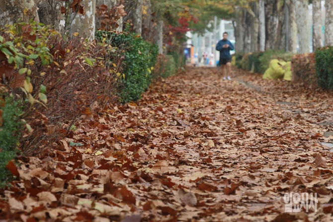 가을의 끝자락이 가까워진 20일 오전 서울 송파구 올림픽공원 인근 인도에 쌓인 낙엽들 사이로 한 시민이 산책을 즐기고 있다.