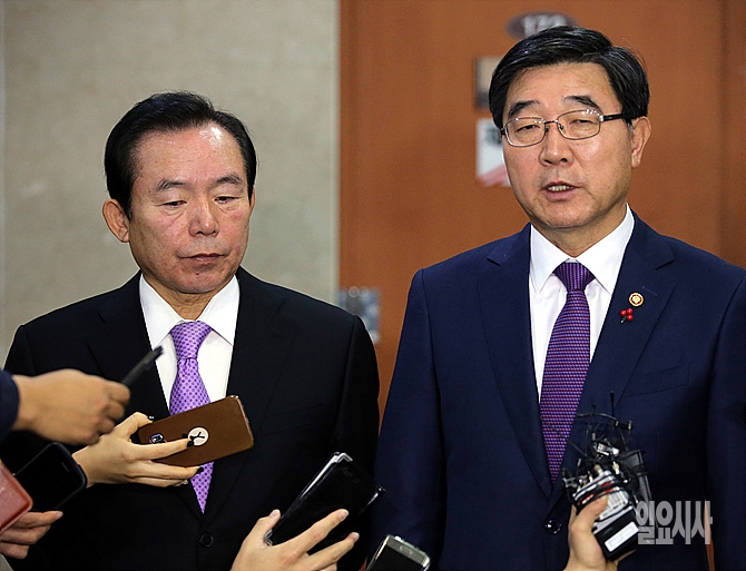 7일, 서울 여의도 국회 정론관 앞에서 이기권 고용노동부장관이 이인제 새누리당 노동선진화특위위원장(사진 왼쪽)과의 '노동개혁법' 관련 기자회견 직후 취재진의 질문에 답변하고 있다.