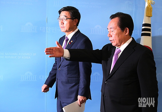 7일, 서울 여의도 국회 정론관에서 이인제 새누리당 노동선진화특위위원장(사진 오른쪽)이 '노동개혁법' 관련 기자회견 직후, 이기권 고용노동부장관의 퇴장을 안내해주고 있다.