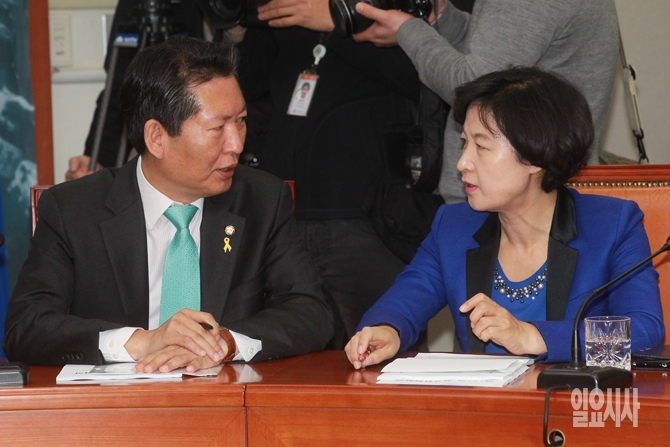 새정치민주연합 정청래 최고위원과 추미애 최고위원이 7일 오전 서울 여의도 국회에서 열린 새정치민주연합 최고위원회의에서 대화를 나누고 있다.