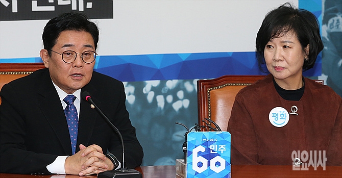 7일, 서울 여의도 국회 당대표실 회의실서 새정치민주연합 전병헌 최고위원과 손혜원 홍보위원장이 '당명관련 기자회견'을 갖고 있다.