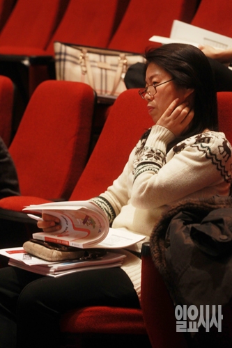 한 대입수험생 학부모가 7일 오후 서울 동대문구 경희대학교 평화의 전당에서 서울시교육청 산하 교육연구정보원의 주관으로 열린 2016 대입 정시전형 대비 학부모 진학설명회에서 입시전문가의 설명을 듣고 있다.