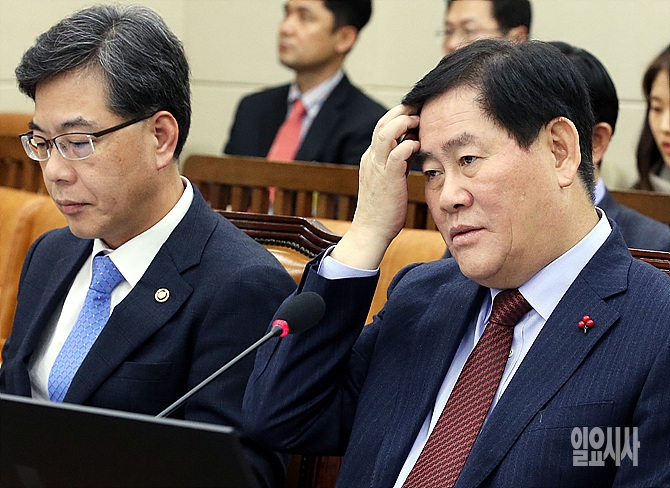 7일, 서울 여의도 국회 기획재정위원회 회의실서 열린 전체회의서 최경환 기획재정부장관 겸 사회부총리가 의원들의 질의에 잠시 곤혹스러운 표정을 하고 있다.