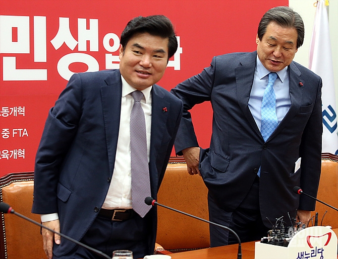 7일, 서울 여의도 국회 새누리당 당대표실에서 김무성 대표와 원유철 원내대표가 '노동법 관련' 박근혜 대통령과의 면담 후 브리핑에 앞서 활짝 웃고 있다.