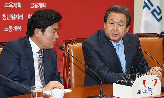 7일, 서울 여의도 국회 새누리당 당대표실에서 김무성 대표(사진 오른쪽)와 원유철 원내대표가 '노동법 관련' 박근혜 대통령과의 면담 후 브리핑에 앞서 잠시 심각한 표정을 하고 있다.